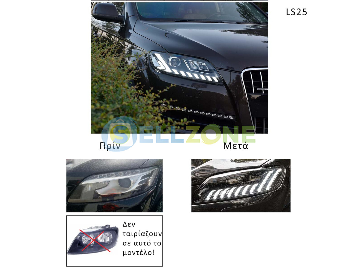 Τα LED φανάρια LS25 δεν είναι κατάλληλα για Audi Q7 με τα πιο βασικά φανάρια. Το σετ LS25-1 περιλαμβάνει καλώδια για αποφυγή σφαλμάτων στο σύστημα, αλλά η λειτουργία προσαρμογής δεν θα υποστηρίζεται.