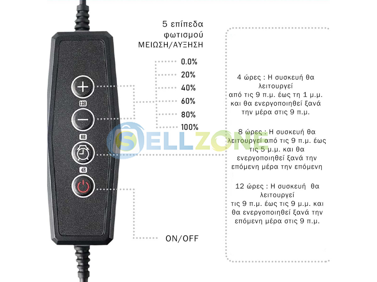 - Ρύθμιση Χρονοδιακόπτη: Επιλέξτε το κατάλληλο χρονικό διάστημα (4, 8 ή 12 ώρες) για την αυτόματη ενεργοποίηση και απενεργοποίηση του φωτός. Οι λάμπες ενεργοποιούνται και απενεργοποιούνται σύμφωνα με τον καθορισμένο χρόνο.