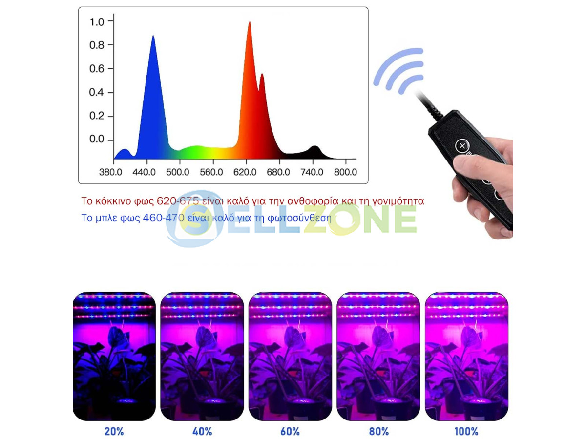 - Ρύθμιση Φωτεινότητας: Με τηλεχειριστήριο μπορείτε να ρυθμίσετε 5 επίπεδα φωτεινότητας (20%, 40%, 60%, 80%, 100%) ανάλογα με τις ανάγκες των φυτών.