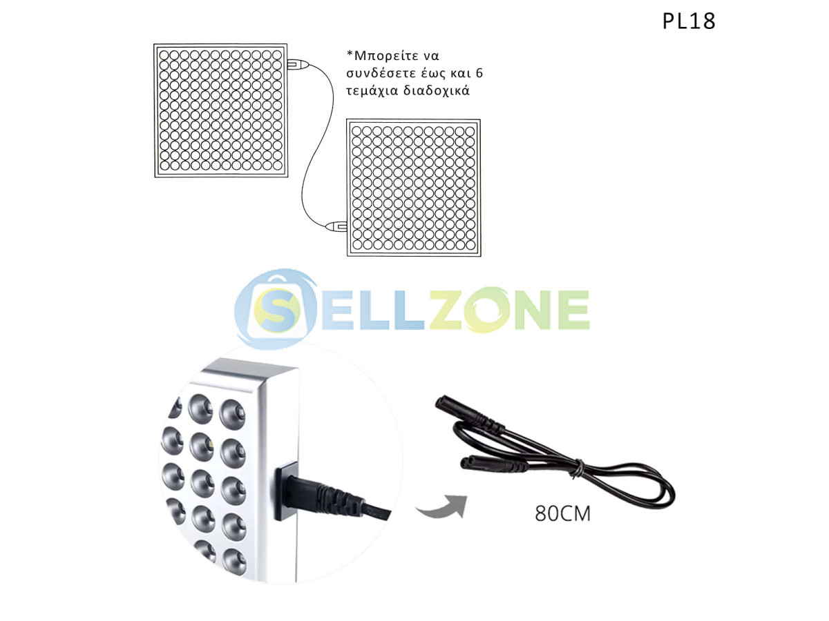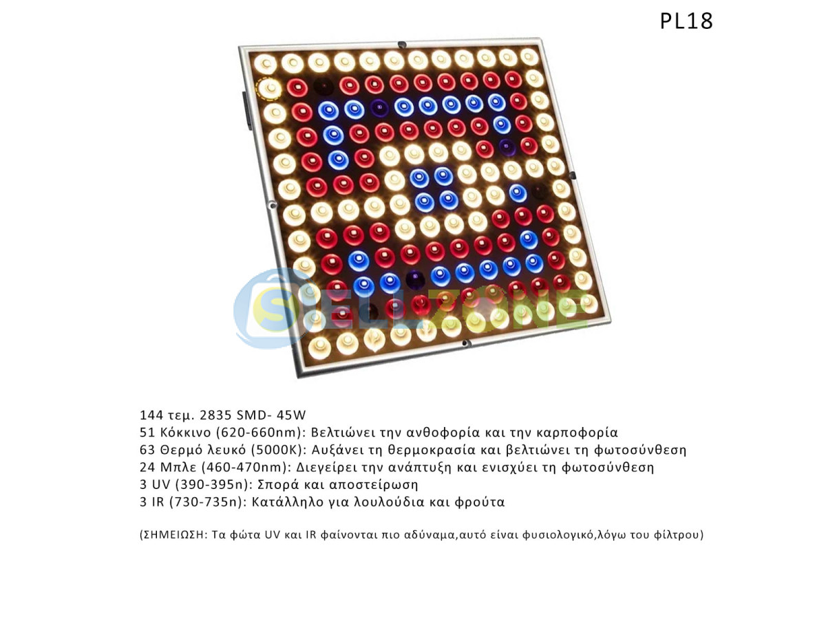 Η LED φυτολάμπα PL18 έχει σχεδιαστεί με καινοτόμο πλήρες φάσμα, ειδικά για την ανάπτυξη φυτών σε εσωτερικούς χώρους. Με ισχύ 45W και 144 εξαιρετικά αποδοτικούς LED, η λάμπα αυτή προσφέρει ιδανικές συνθήκες για υγιή και ισχυρή ανάπτυξη των φυτών σας.