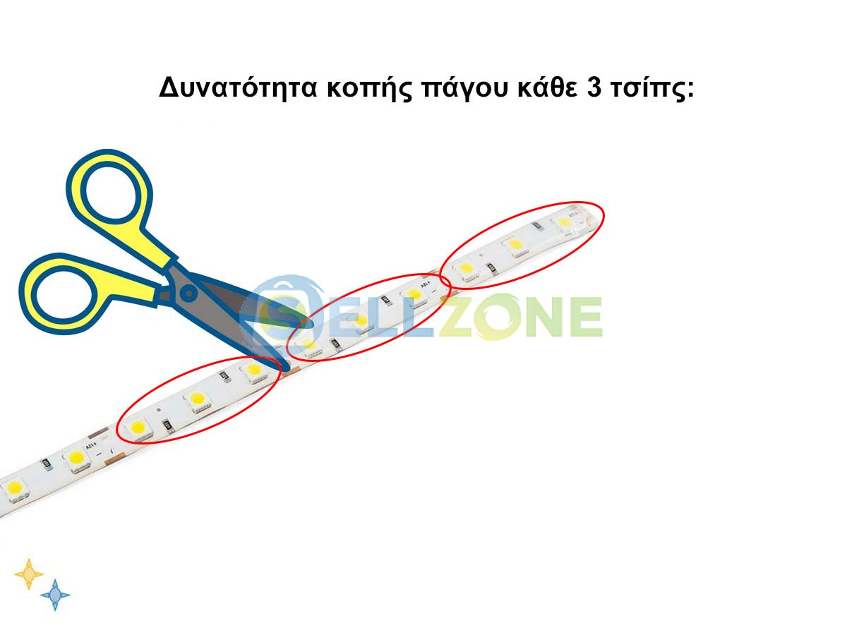 - βράχυνση και προσαρμοστικότητα- για να κοντύνετε τις λωρίδες είναι απαραίτητο να αφαιρέσετε προσεκτικά το πλαϊνό καπάκι, μετά το οποίο μπορούν να κοντύνονται κάθε τρία κομματάκια LED. Πρέπει να κόψετε και να ξαναβάλετε το καπάκι.