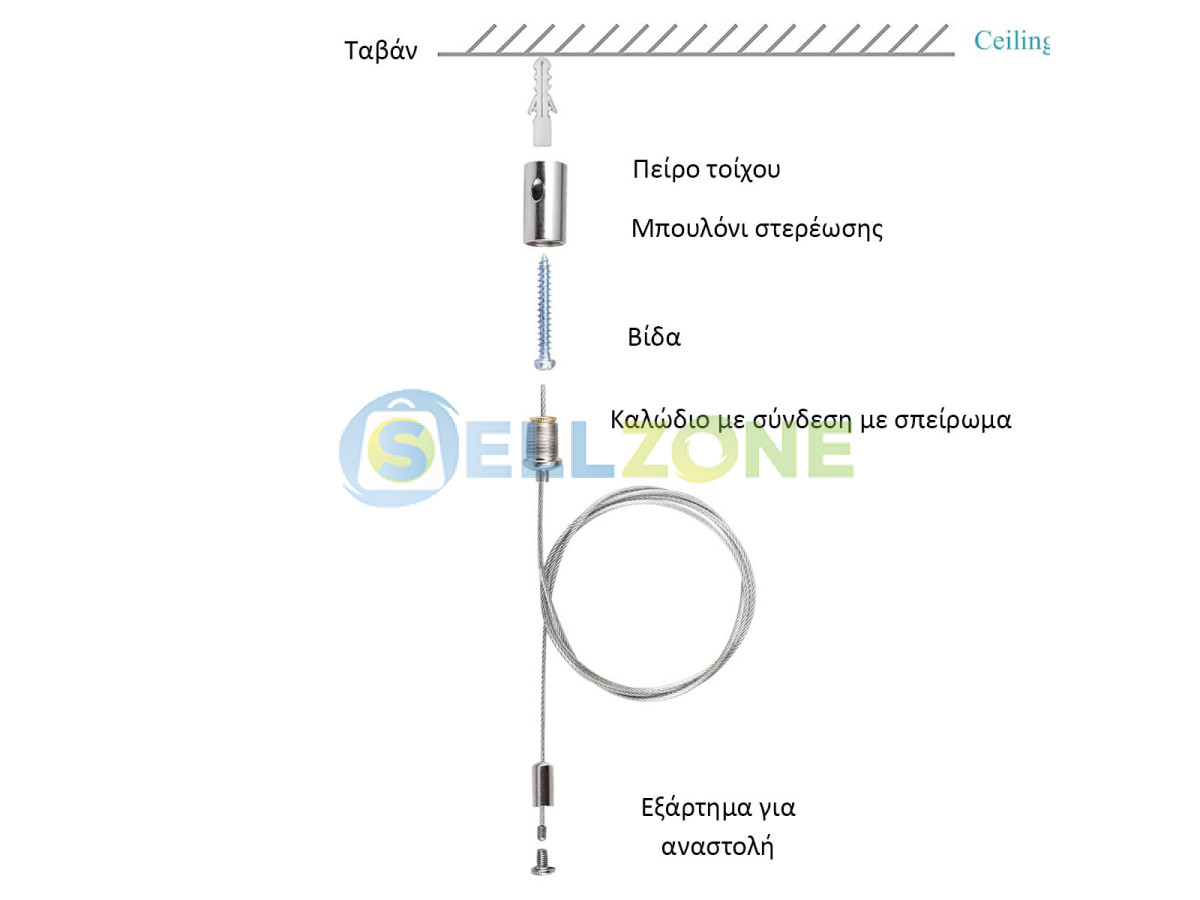 Η τοποθέτηση είναι εύκολη και δεν απαιτεί ειδικά εργαλεία – μόνο τρυπάνι και κατσαβίδι. Στερεώνετε τις κρεμάστρες φωτισμού LED στην οροφή με το παρεχόμενο ούπα και τη βίδα, και συνδέετε το άλλο άκρο στον πίνακα ή την κατασκευή με το βιδωτό εξάρτημα και τον προσαρμογέα. Συνιστάται τοποθέτηση ανά περίπου 1 μέτρο για ομοιόμορφη κατανομή βάρους και συμμετρία. Κάθε συρματόσχοινο αντέχει βάρος έως 8 κιλά.