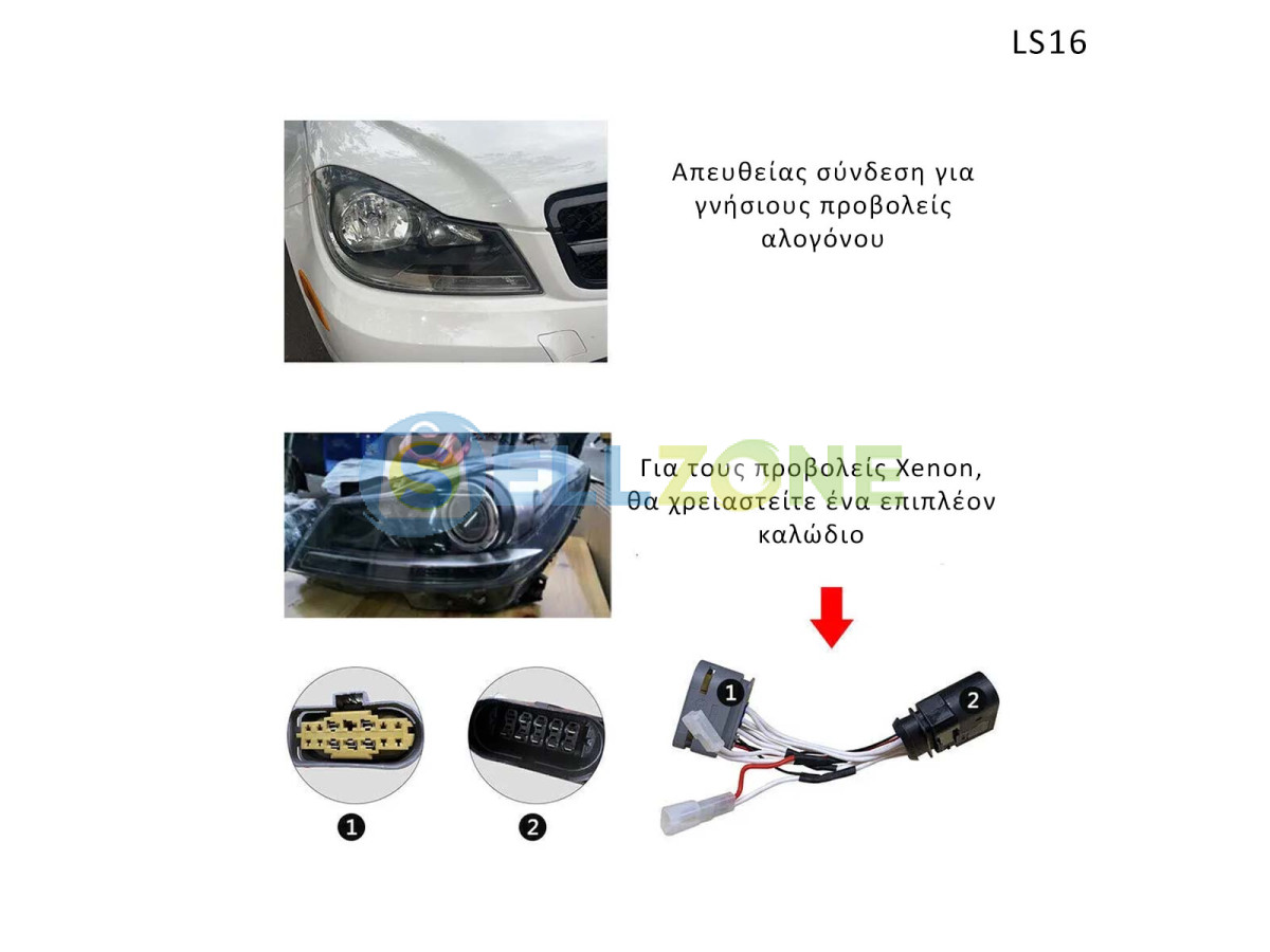 - Προϋποθέσεις: Για Xenon φανό, απαιτούνται επιπλέον καλώδια που περιλαμβάνονται στην συσκευασία του LS16-1.